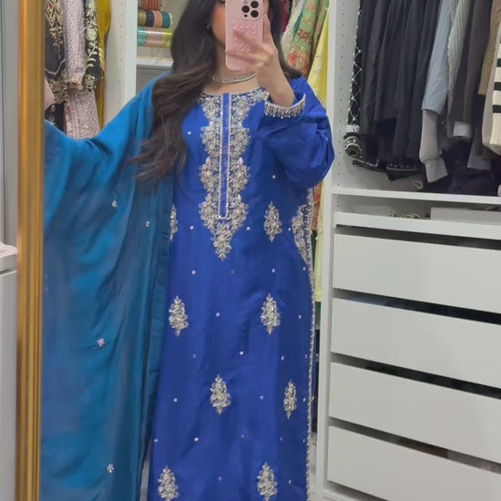 This elegant royal blue outfit features lightly crushed silk, adorned with intricate hand embroidery, including Kira, dabka, and nakshi arri work. It is accompanied by loose trousers and a lightweight dupatta.