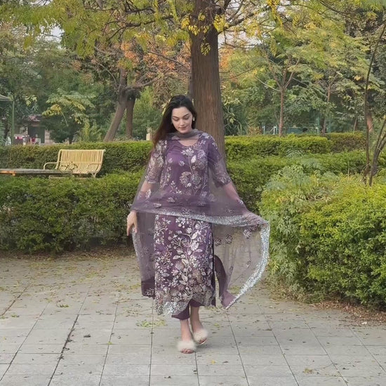 Masterfully crafted heavy cutdana work adorns a sheer net dupatta, accented with a rich silk border and sequin embroidery. The ensemble features an elongated shirt with elbow-length sleeves paired with tailored plain trousers. Choose from two captivating color options.