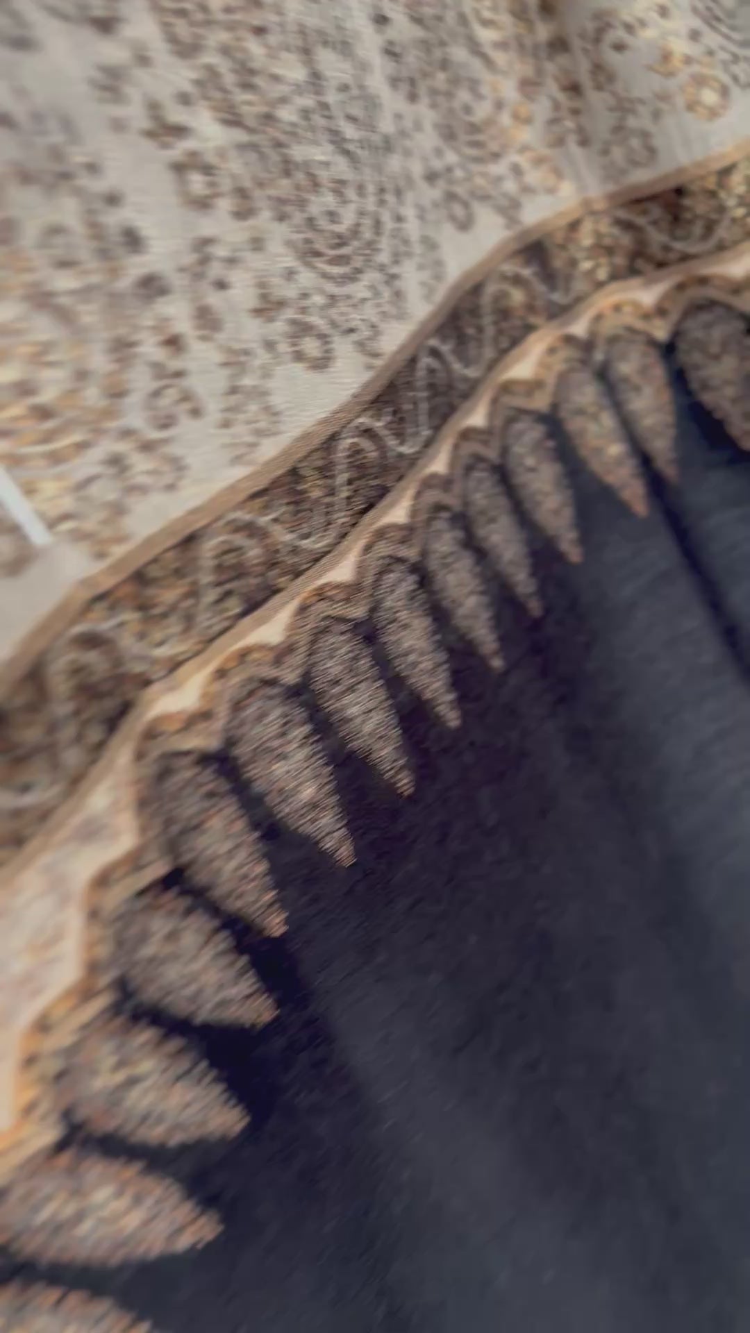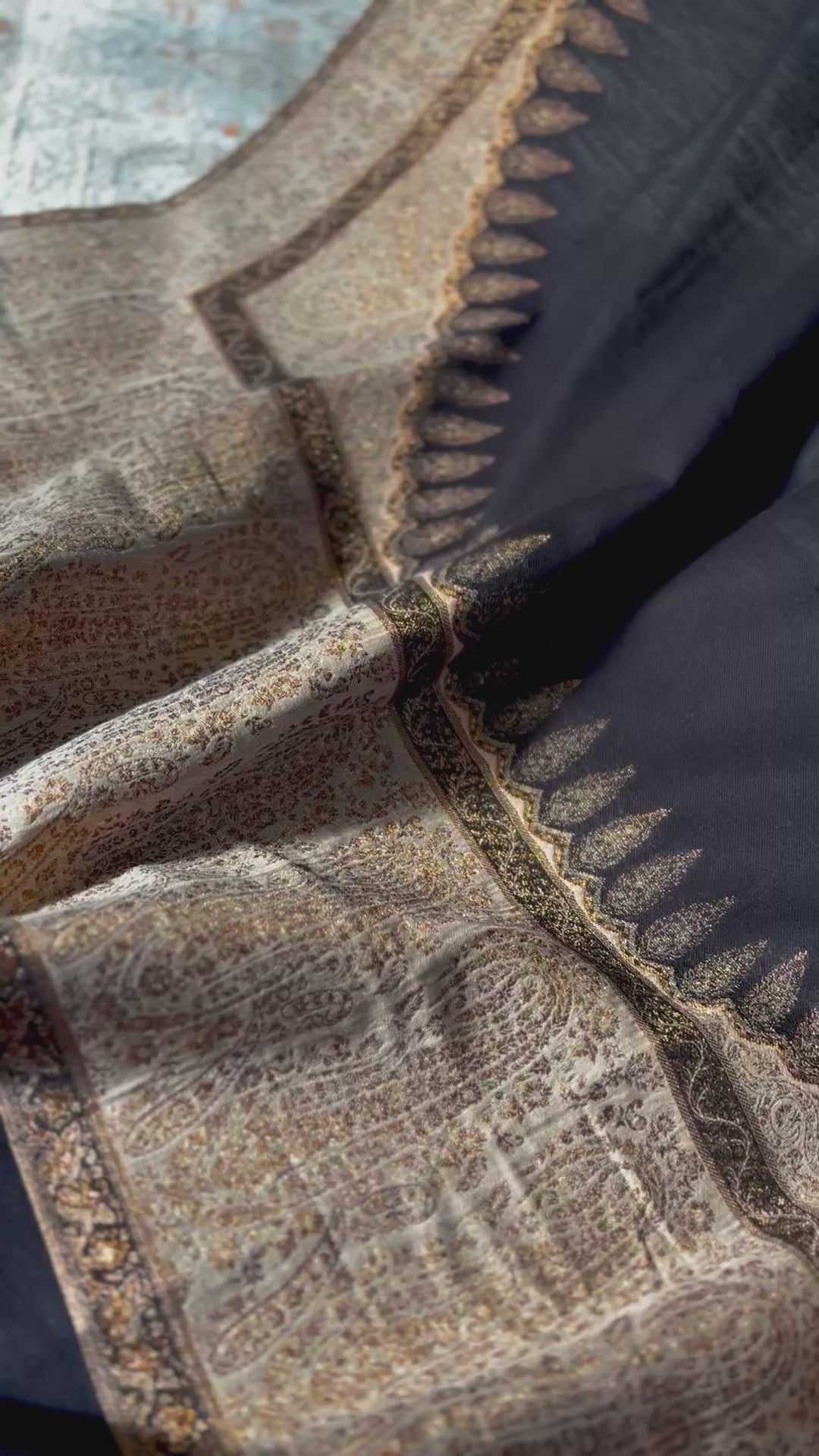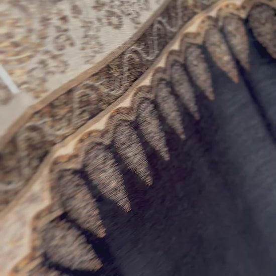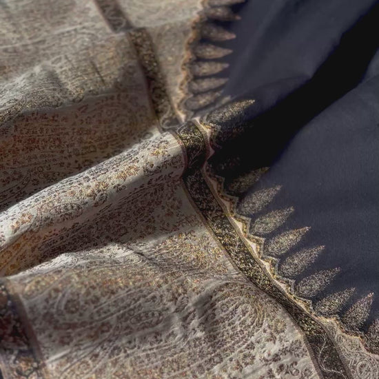 Bold gold zari detailing against rich black—a statement piece rooted in centuries of Kani weaving tradition and generously proportioned at 42" × 82" for dramatic drape and complete coverage. This silk-blend treasure glows with understated luxury, whether worn to winter galas, formal affairs, or as an everyday declaration of refined taste. Heirloom-quality craftsmanship that demands to be passed down.