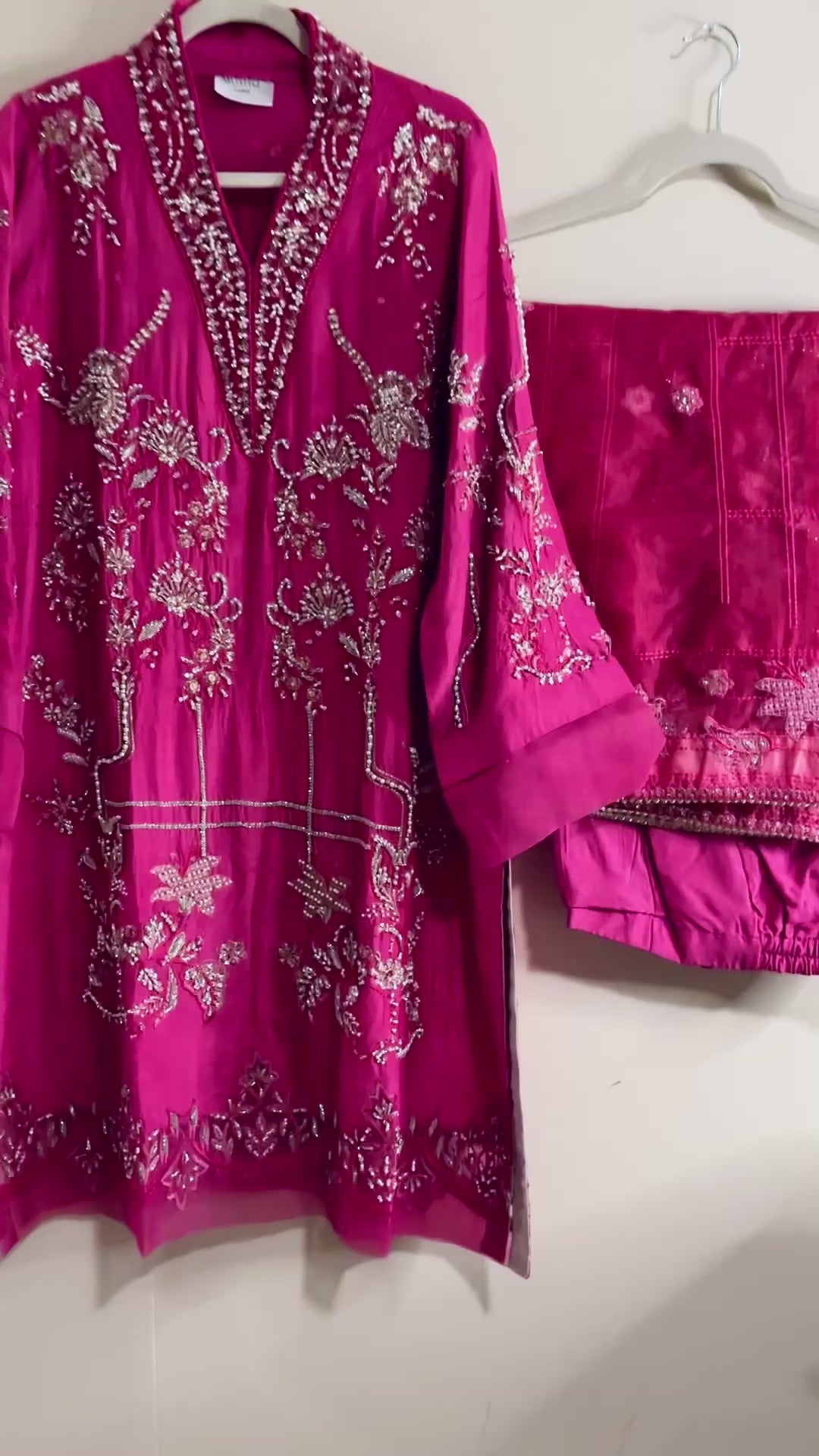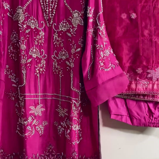 Immerse yourself in opulence with this shirt showcasing pure resham embroidery enhanced by hand-embellished Swarovski crystals, tilla, dabka, and naqshi gemstones. The design is elegantly finished with laces on the daman and hem, complemented by pants featuring hand-embellished organza embroidered borders. The ensemble is completed with a dupatta adorned in a four-sided sequins embroidery with a striking geometric and floral jaal formation.