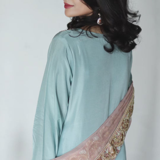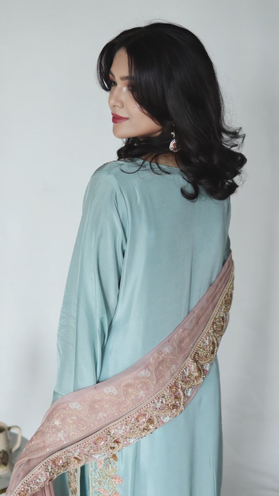 Luxe pastel silk and chiffon ensemble featuring an exquisite hand-embroidered dupatta with intricate dabka, naqshi, and arria work framed by a stunning four-sided border. Paired with premium silk trousers for effortless elegance. Crafted for the discerning eye—where artisanal embroidery meets refined comfort.